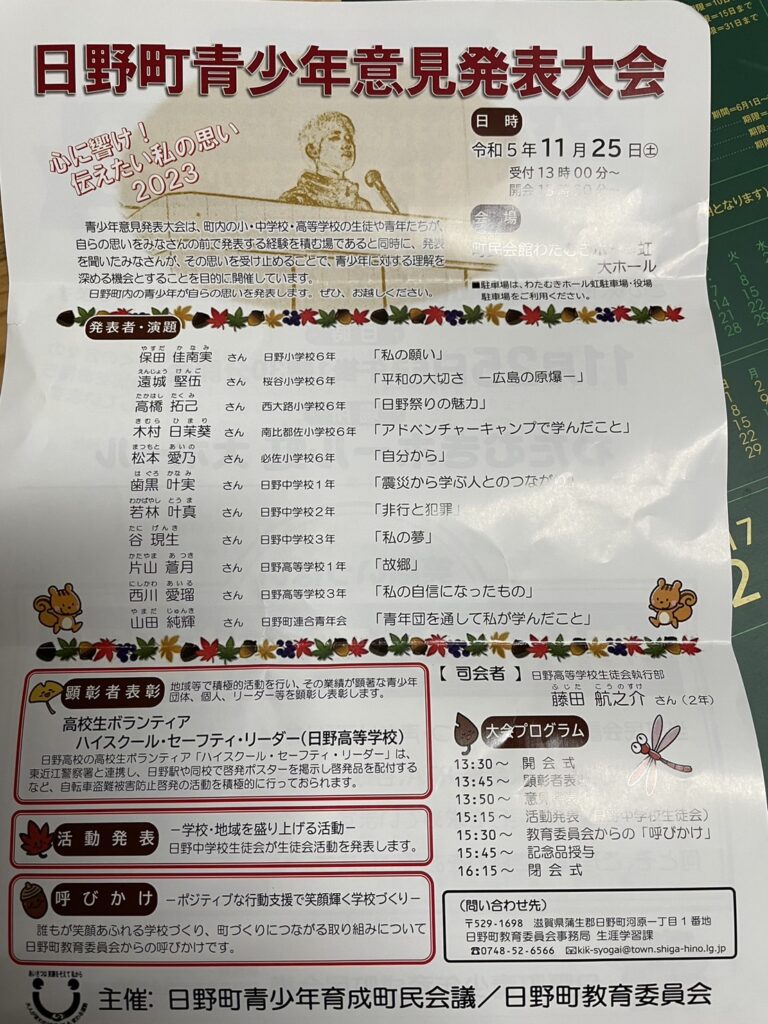 本日は(11/25)令和5年度日野町青少年意見発表大会で町民会館わたむきホール虹 大ホールに伺いました。みなさんとても素晴らしい発表でした。